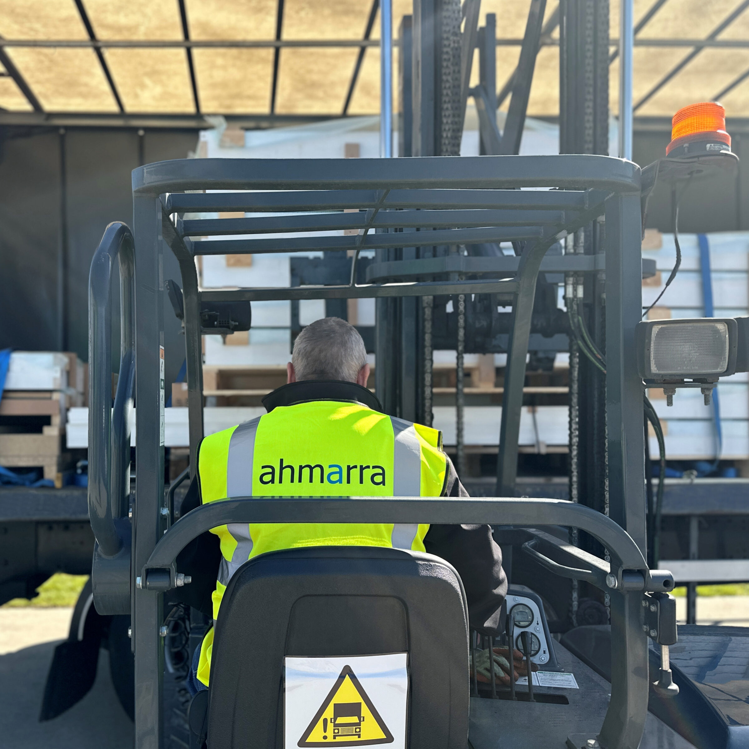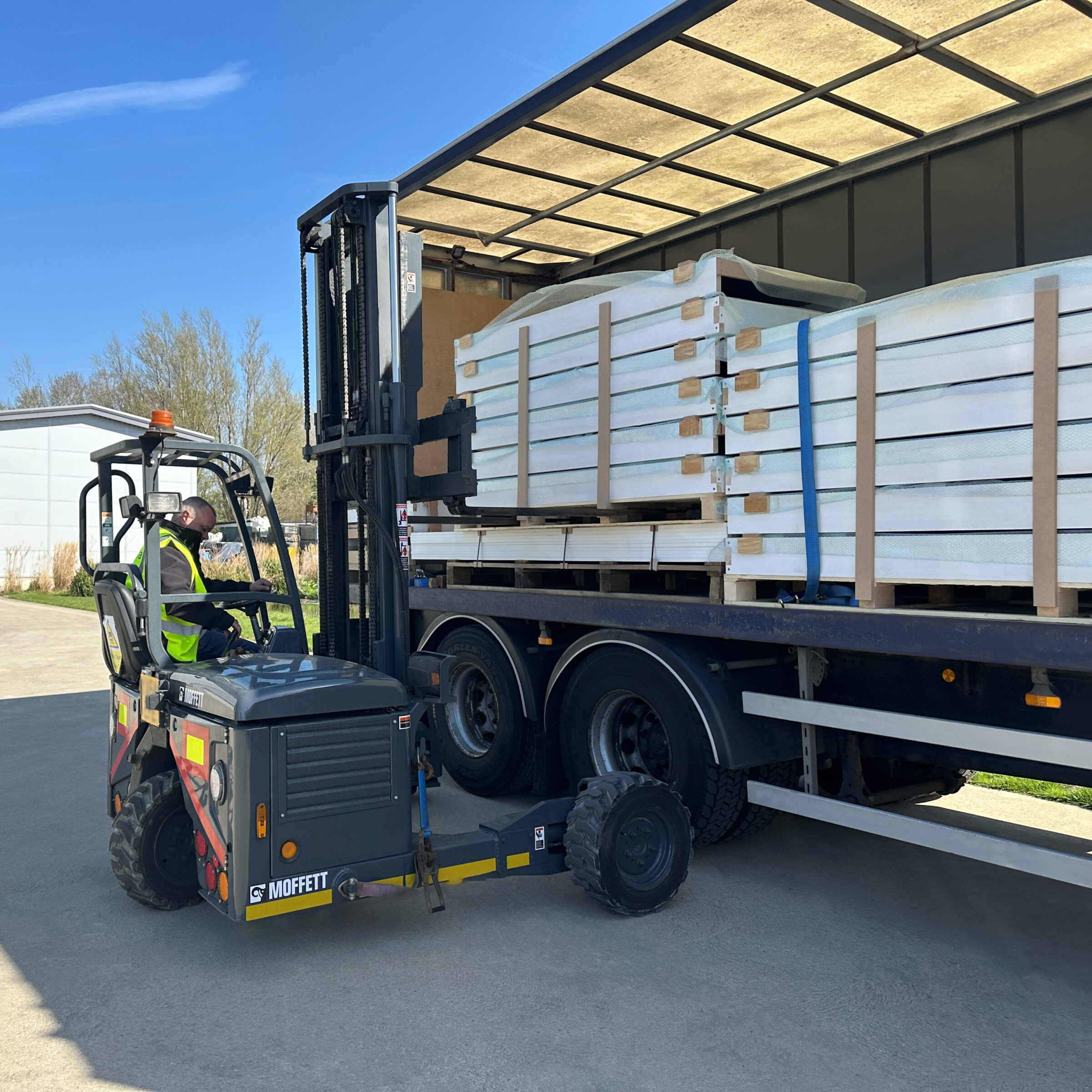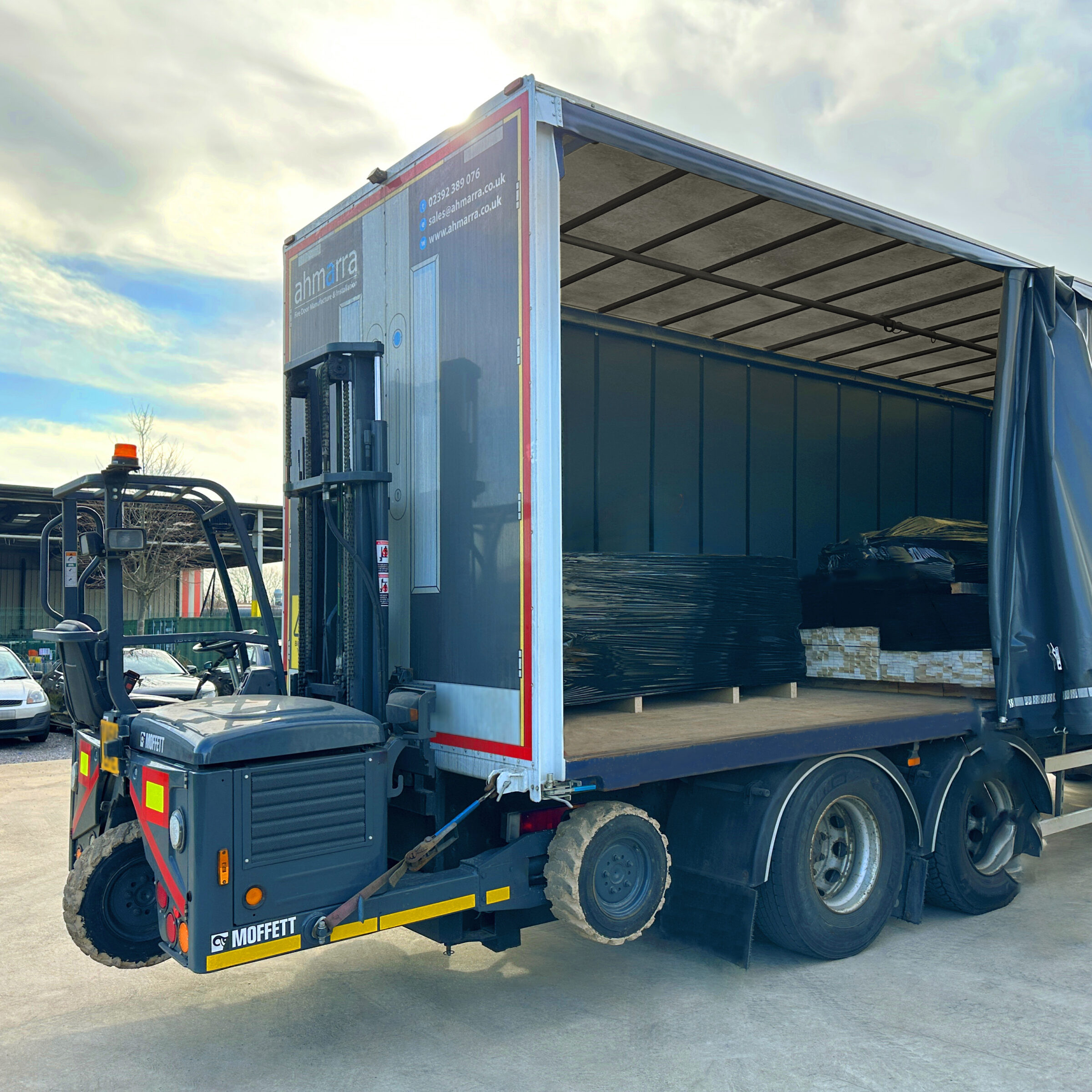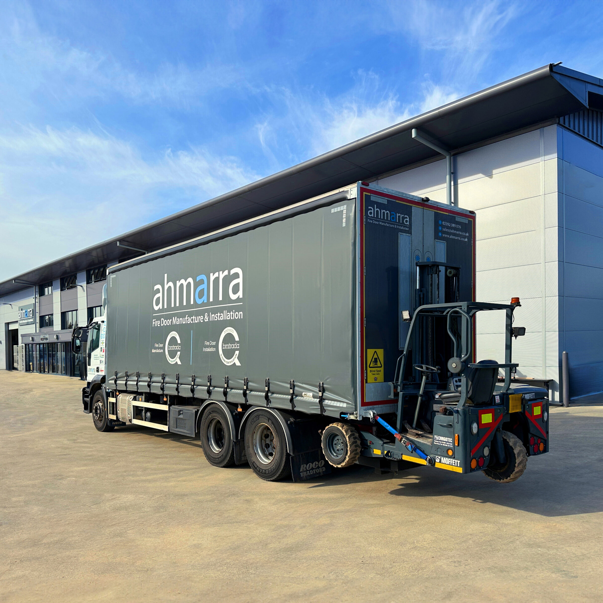 Ahmarra offer an in-house moffett truck delivery service. Ideal for sites that may not have a forklift available, we can unload and manoeuvre your fire door deliveries at your site using our moffett fork lift.
