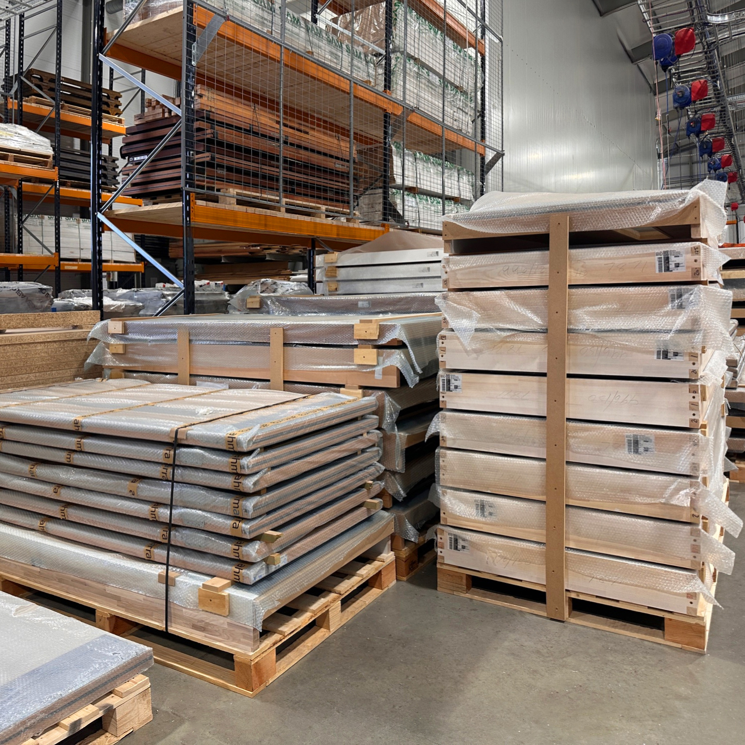 The doorsets are stacked and braced in quantities of 8 to 10 per pallet.