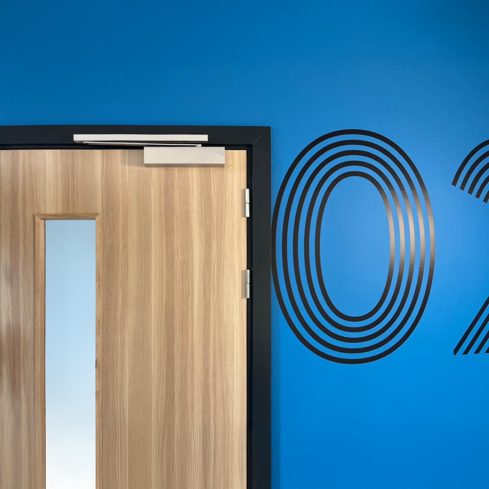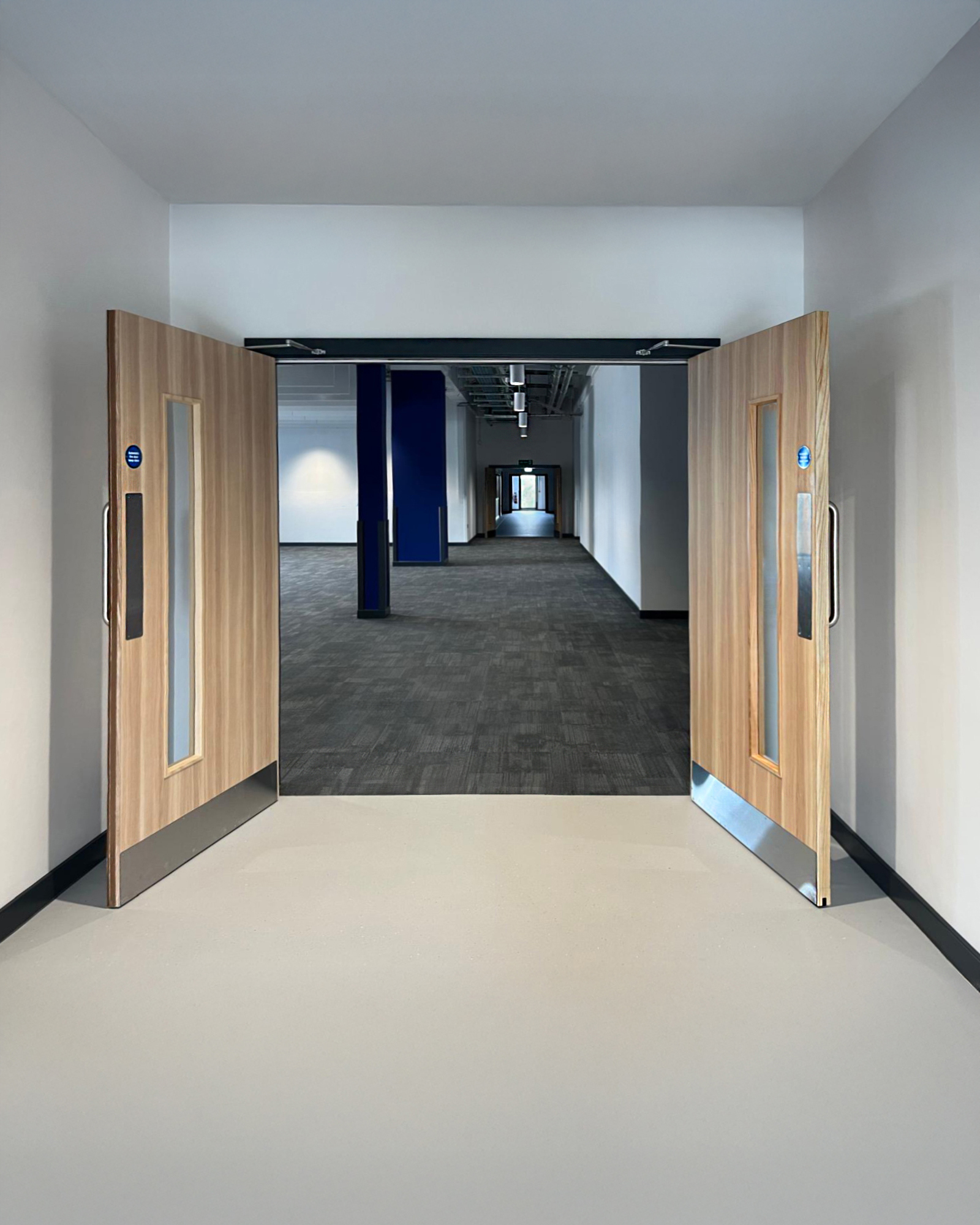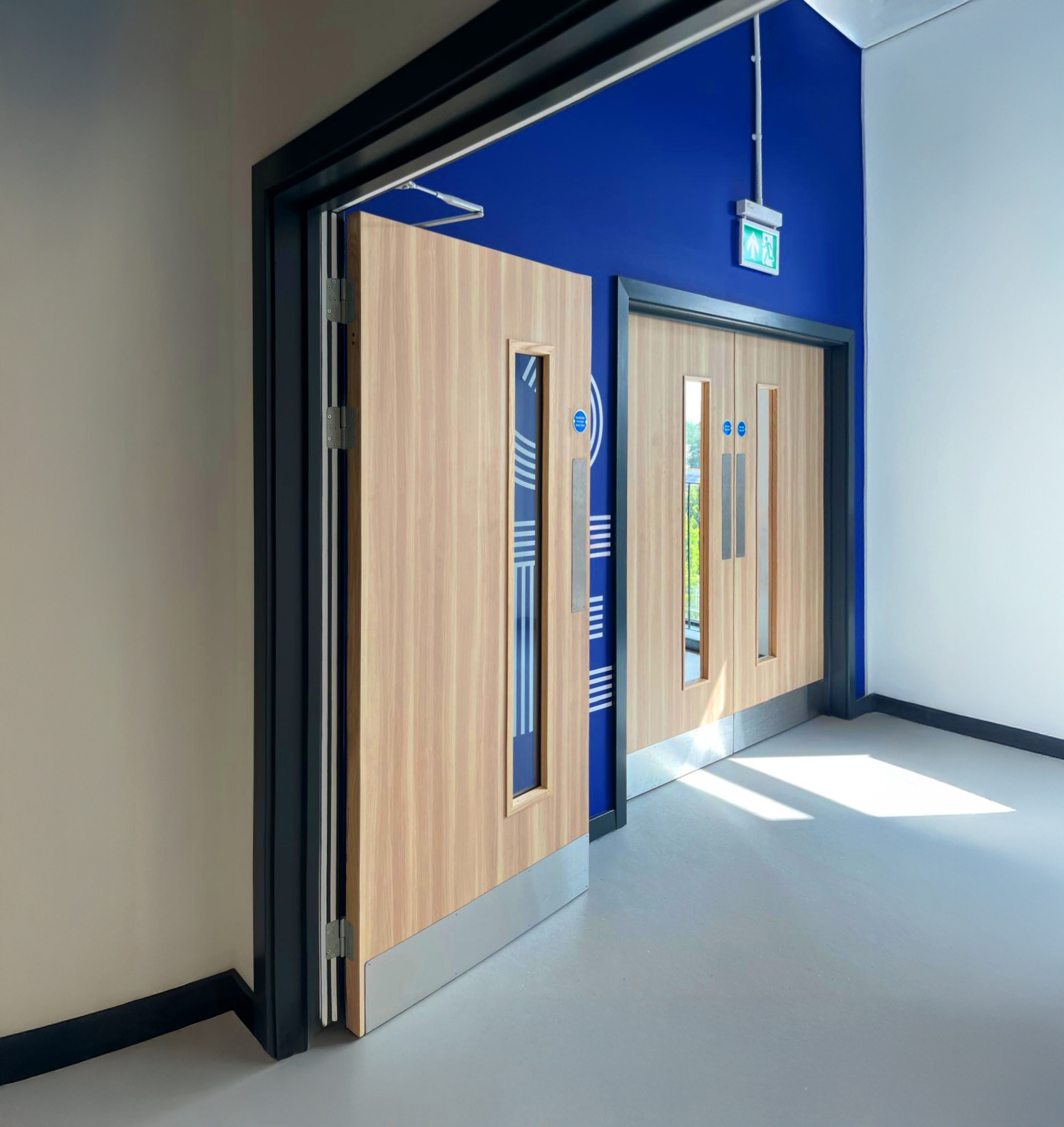 Corridor doors feature Dormakaba electro magnetic  closers with double-action configuration. The built-in hold-open functionality, means that the closers hold the doors open for ease of movement around the college, yet will automatically close in the event that a fire alarm is activated, therefore compartmentalising the fire. These highly efficient Dormakaba closers require a low opening force, ensuring doors can be opened with ease by all building users.