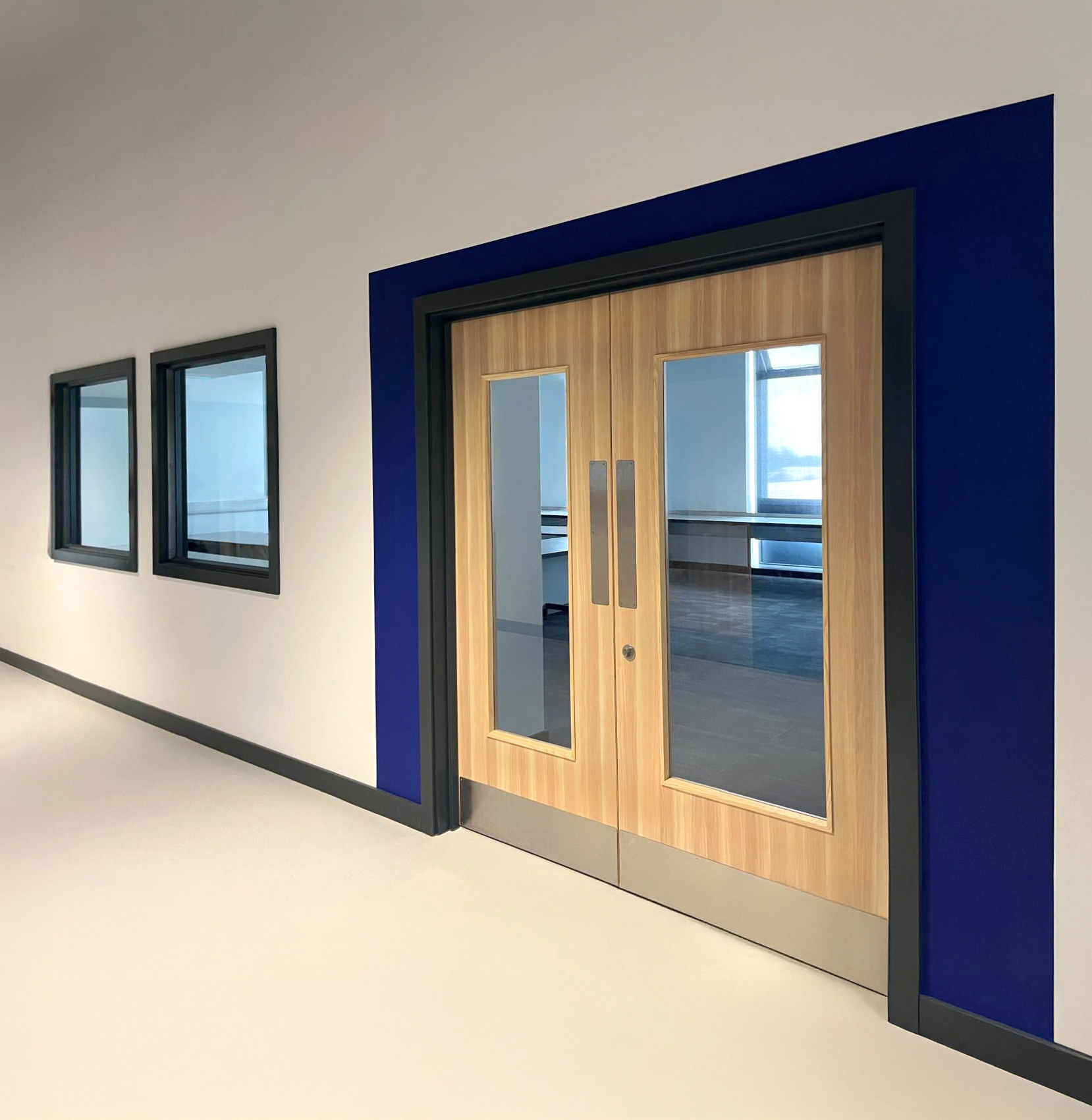 Maximising natural light and visibility throughout the college, many of the communal area and classroom doors feature our standard VP01 – and wider VP02 – vision panels, both of which meet the minimum zone of visibility as defined by BS 8300. Many of the classroom doors also have side screens.